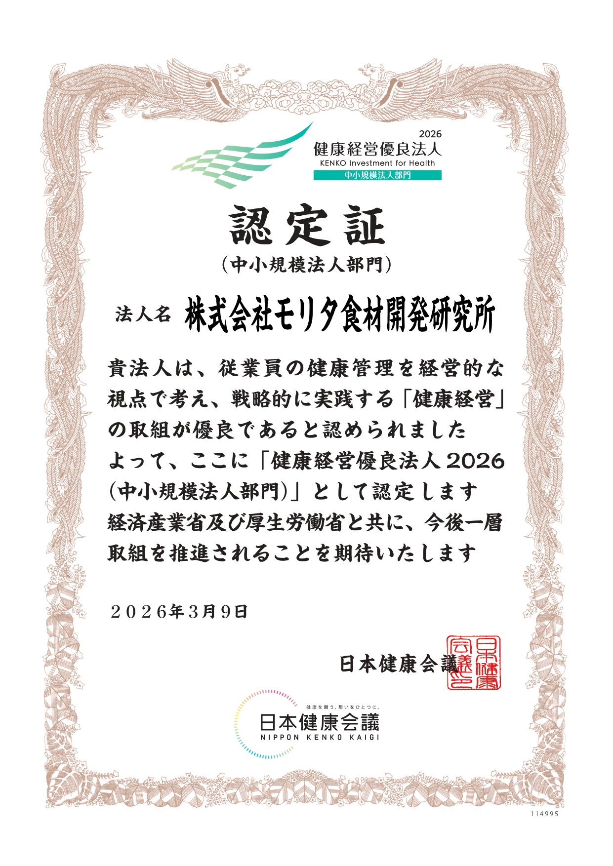 モリタ食材開発研究所(守田悦雄社長)は3月22日、経済産業省「健康経営優良法人2024(中小規模法人部門)」に認定されたと発表した。